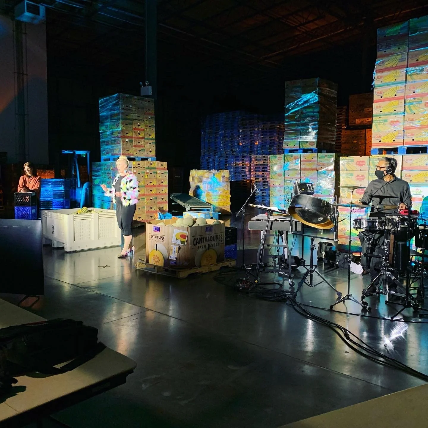 Lights, camera, fundraising action! Our livestream broadcast for Food Lifeline - a big stage set inside the Food Lifeline food warehouse, with all the talent safely distanced.