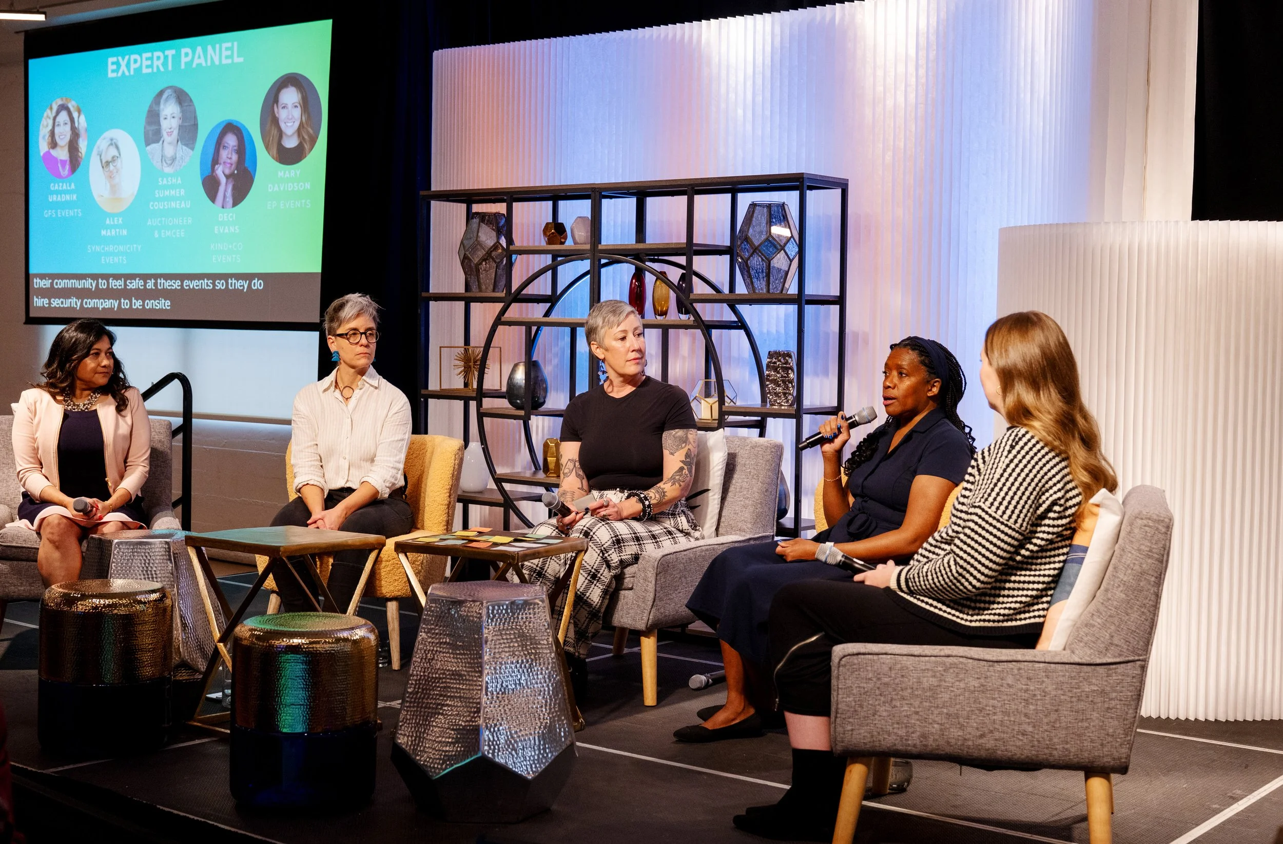 From the left to right: Gazala Uradnik of GFS Events, Alex Martin of Synchronicity Events, our emcee Sasha Summer Cousineau of Revel Rouser Events, Deci Evans of Kind & Co Events, and Mary Davidson of EP Events on the stage of Mini-Con 2026. Photograph by Barbie Hull Photography.